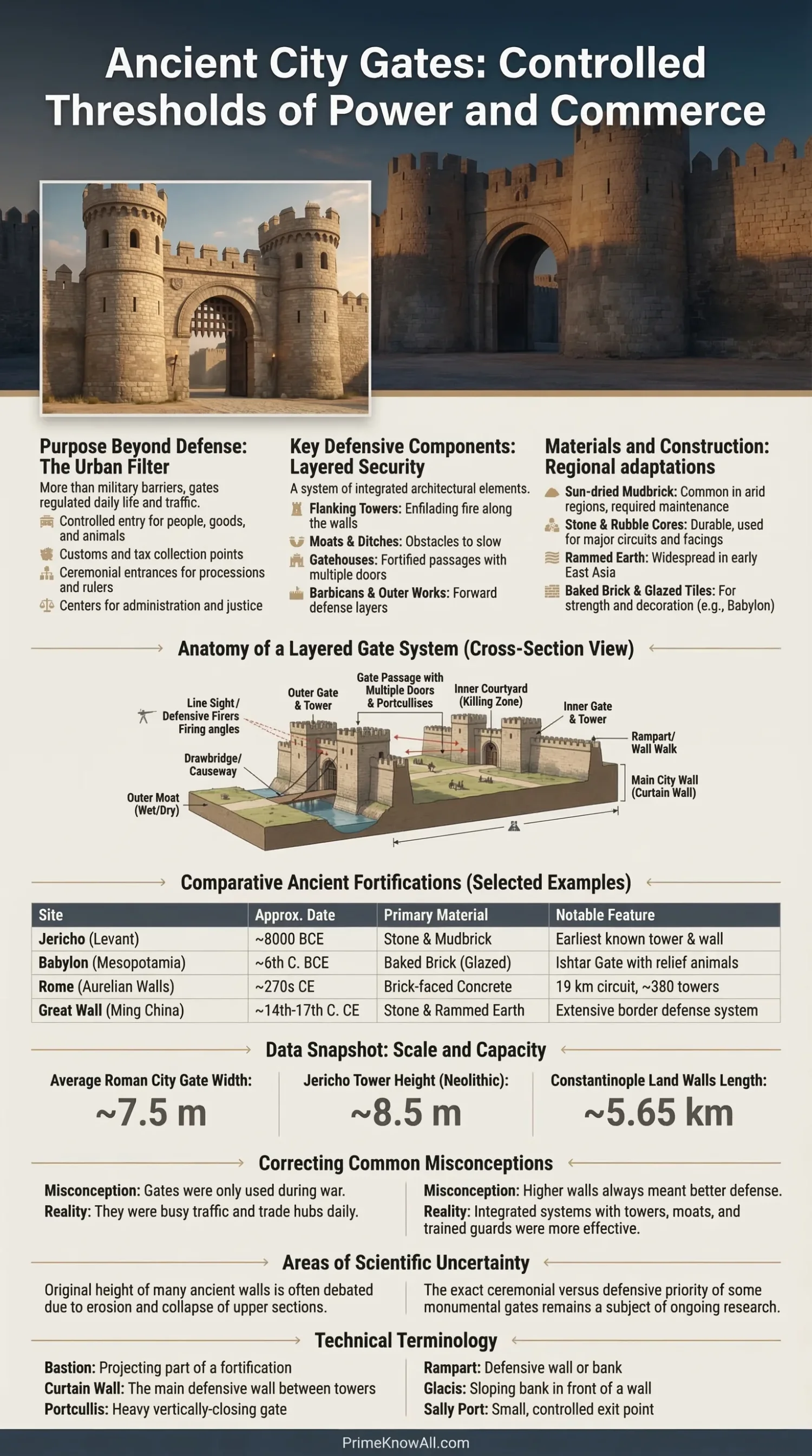 Ancient city gates and fortifications were parts of living urban systems, not isolated military shells. They defended water, stored food, roads, archives, markets, and ritual space while also telling outsiders how a city wanted to be seen.