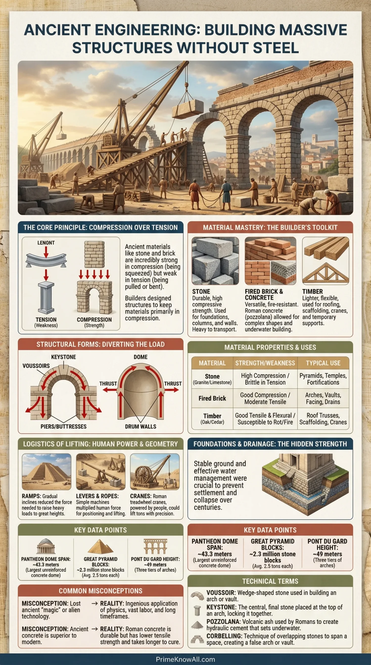 If you remember one thing: ancient builders did not “replace steel” with one magic material. They used mass, compression, geometry, friction, good foundations, and patient logistics together.
