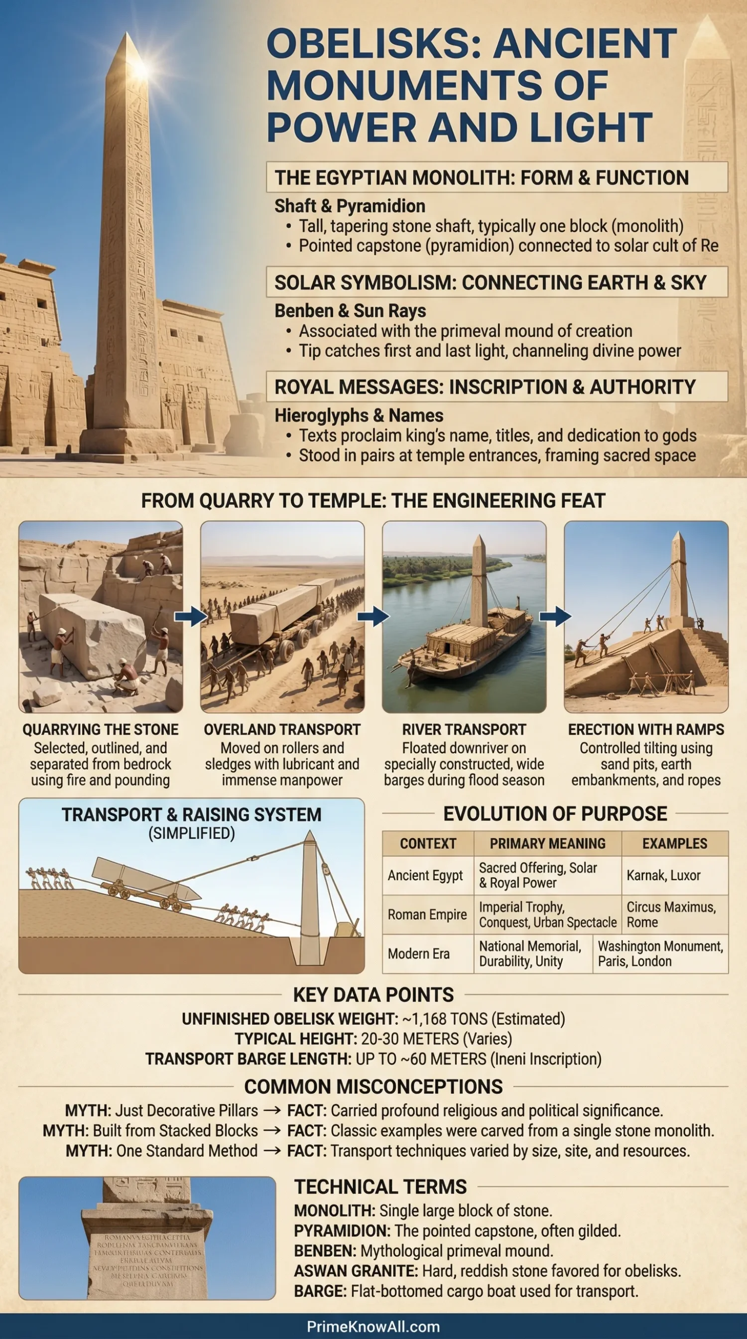 Obelisks were never just tall stones. In ancient Egypt, they were solar monuments cut from a single block, raised near temple entrances, and filled with royal messages about gods, kings, and order.