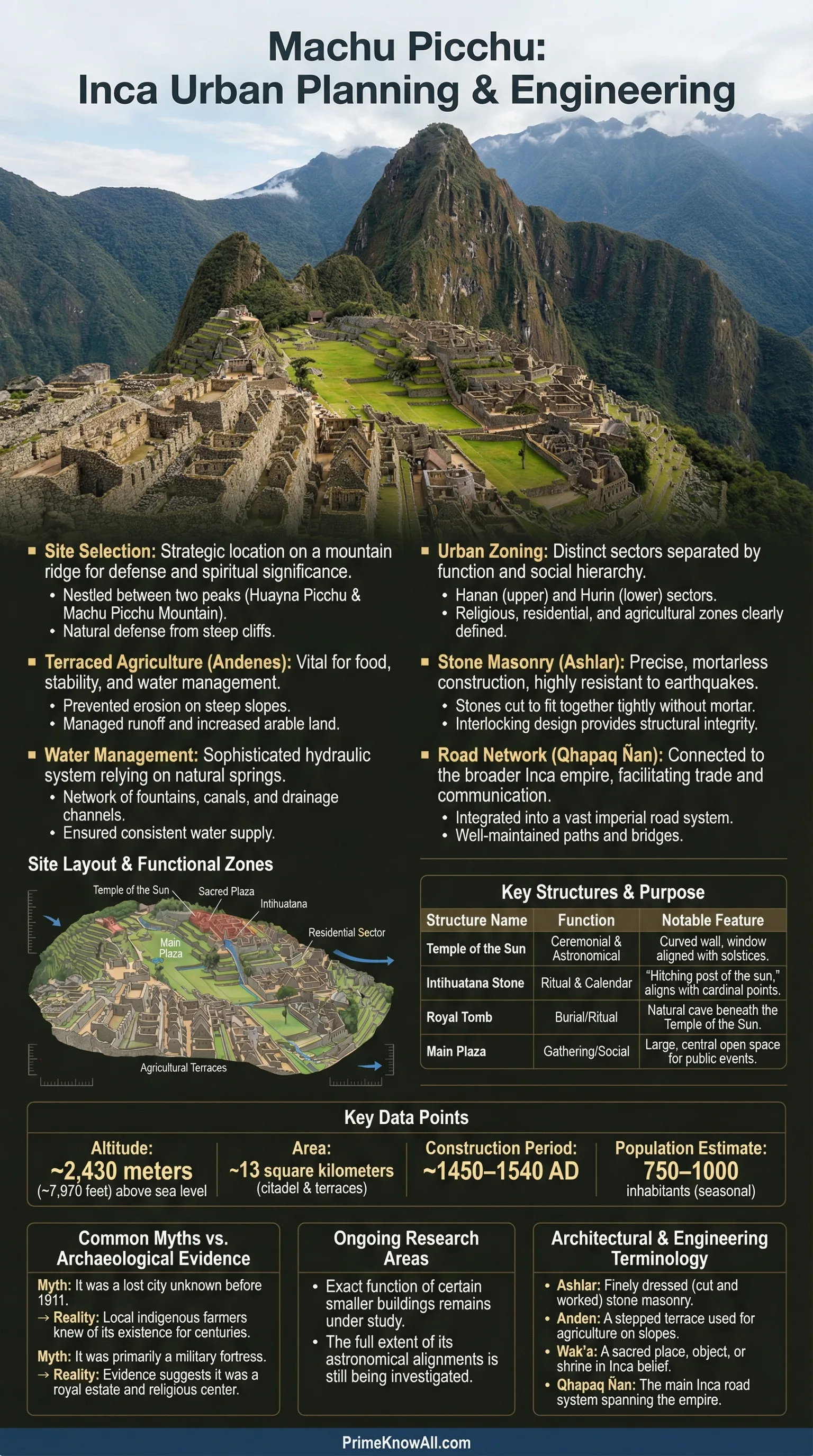 Inca planning typically aimed to do several things at once: keep the settlement self-sustaining, manage water, express status through space, and support ritual life without separating it from daily function. At Machu Picchu, those goals overlap so tightly that “engineering” and “architecture” are hard to separate.