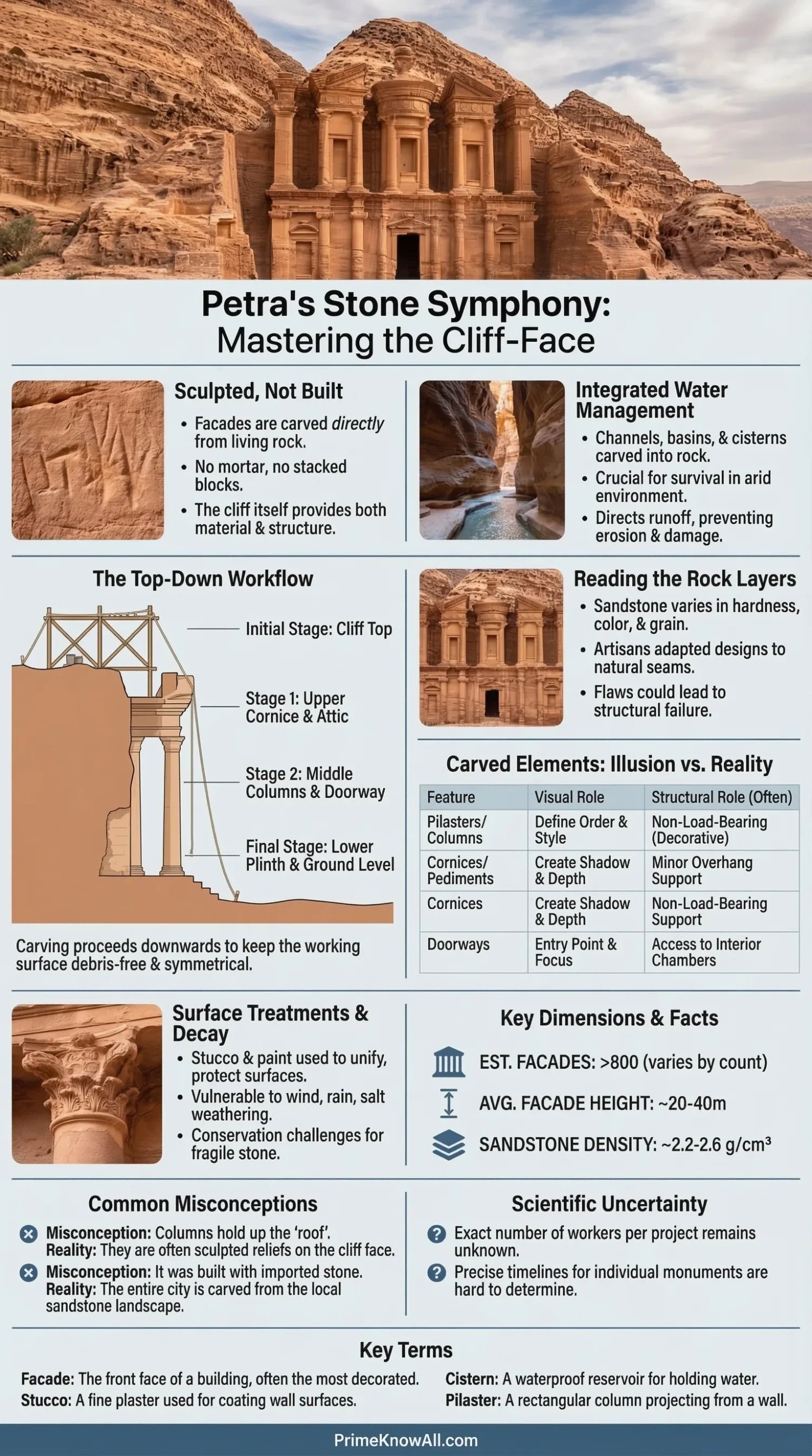 - Many Petra monuments use a top-down carving order so falling debris does not ruin finished work below.
