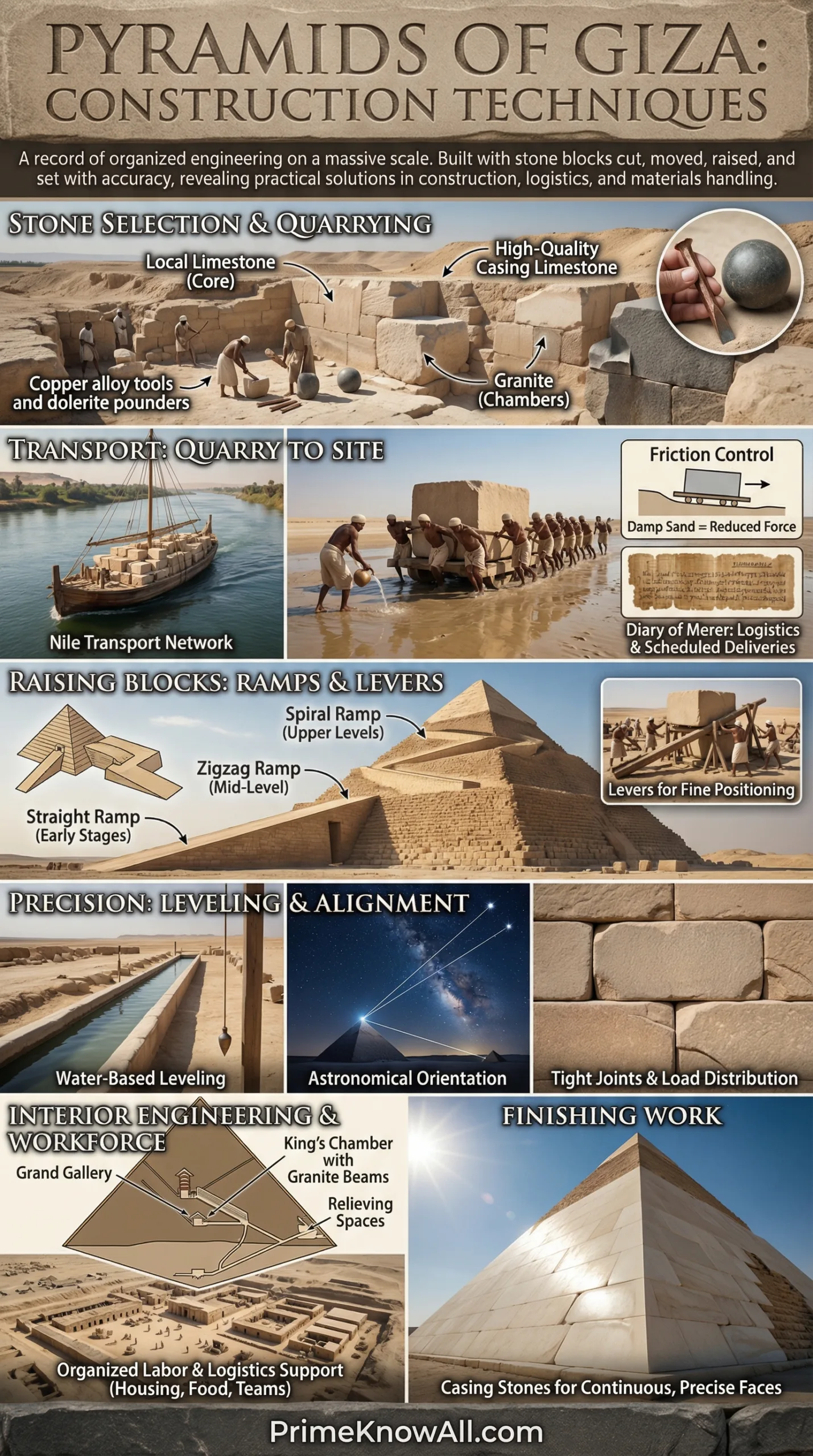 A useful way to think about Giza is that the builders combined three ingredients: simple machines (sledges, levers, ramps), measurement practice (leveling and alignment), and project management (teams, schedules, logistics). Remove any one of these, and the project becomes dramatically harder. Together, they form a coherent engineering approach that still feels recognizable in modern construction, just executed with different materials and different power sources.