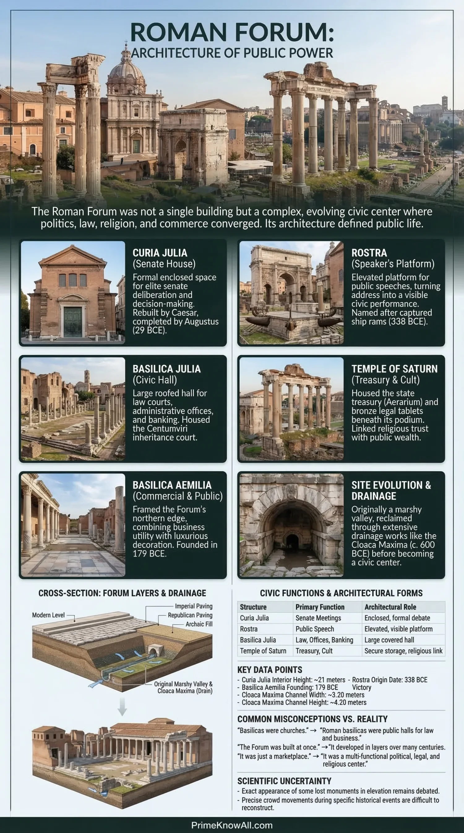 The Roman Forum was the main civic center of ancient Rome. Its architecture brought senate business, public speech, law, religion, and state memory into one tightly arranged place. Buildings such as the Curia, Rostra, Basilica Julia, Basilica Aemilia, and Temple of Saturn did different jobs, but together they turned architecture into government.