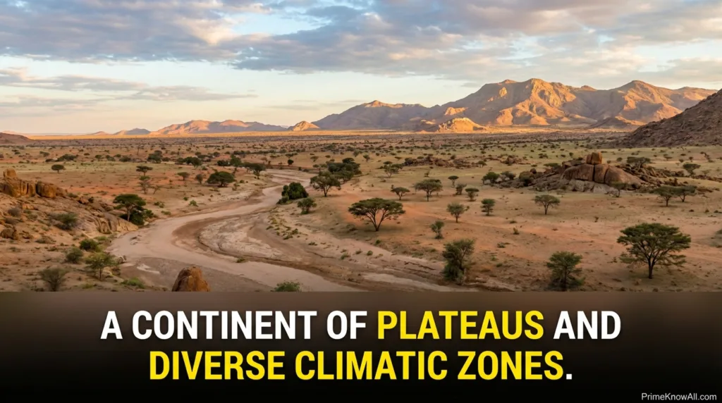 Africa is often called a continent of plateaus, with large interior highlands and long stretches of coastline. It straddles the equator, which gives it a powerful mix of climatic zones—from tropical rainforests to Mediterranean coasts.