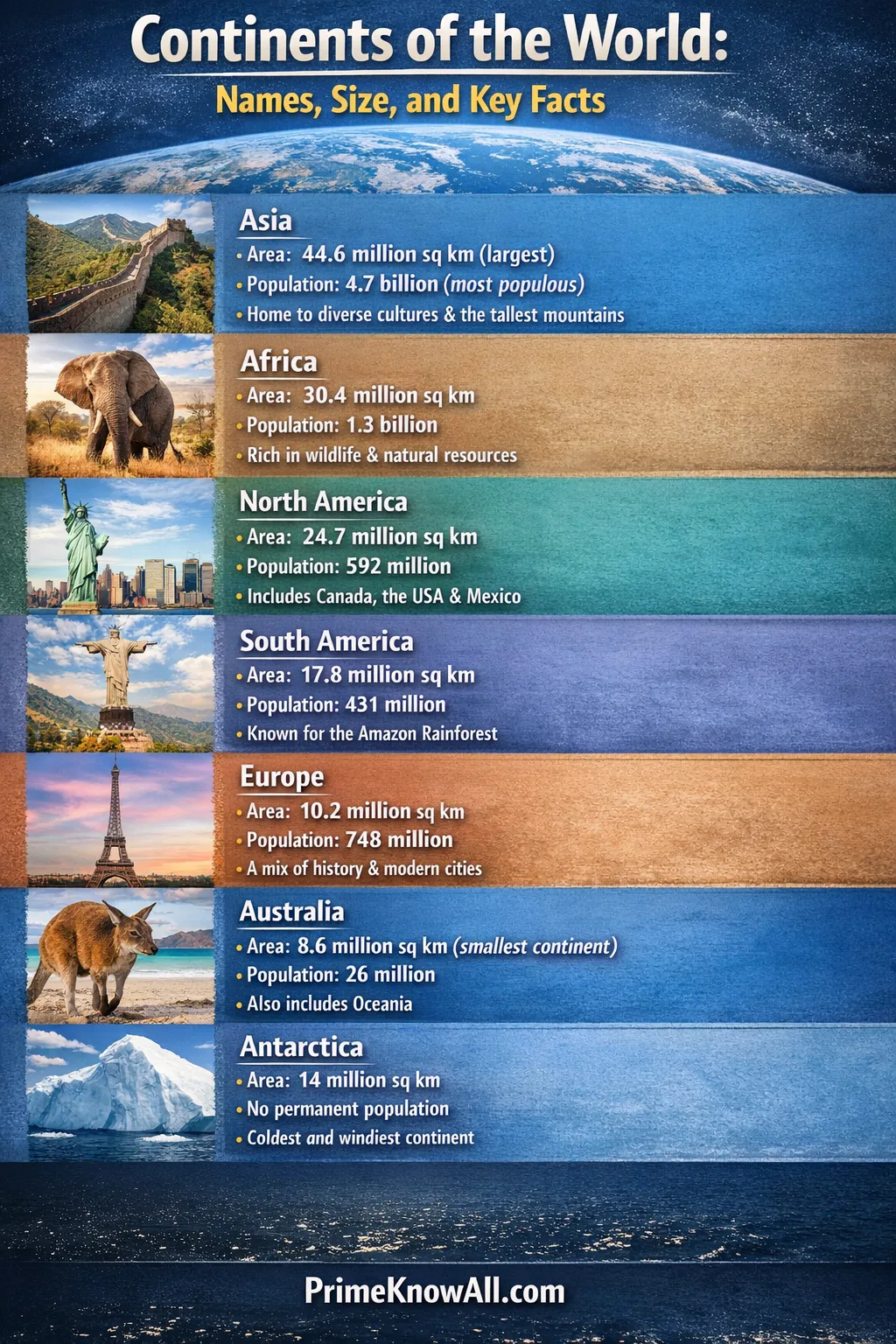 | Continent | Approx. Area (million km²) | Approx. Population (recent estimates) | Highest Point (commonly cited) |