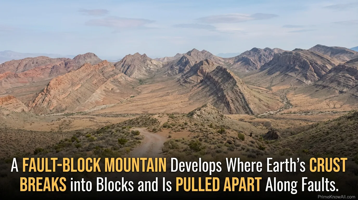 - Fault-block mountains form where the crust stretches, breaking into blocks that lift or drop along faults.