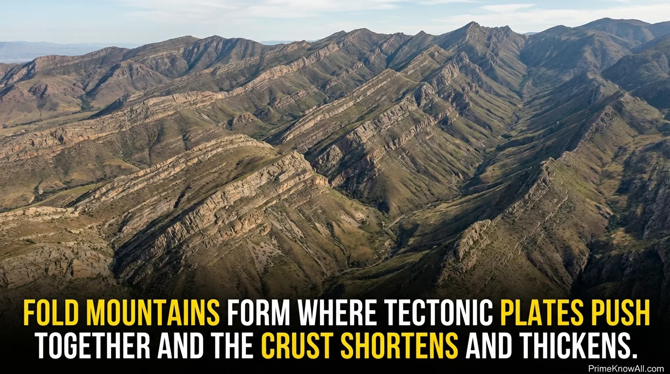 - Fold mountains form where plates push together, making rock layers bend and stack into long ranges.