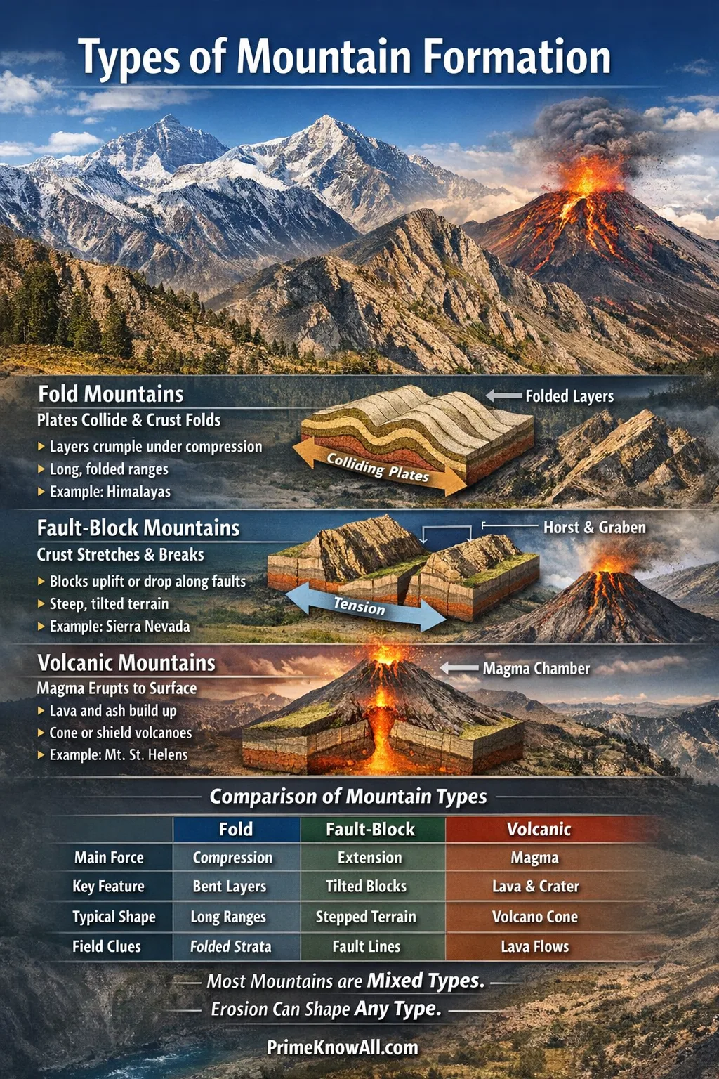 If you remember one thing: identify the main force—compression, extension, or volcanism—and the mountain type becomes much easier to recognize and explain.