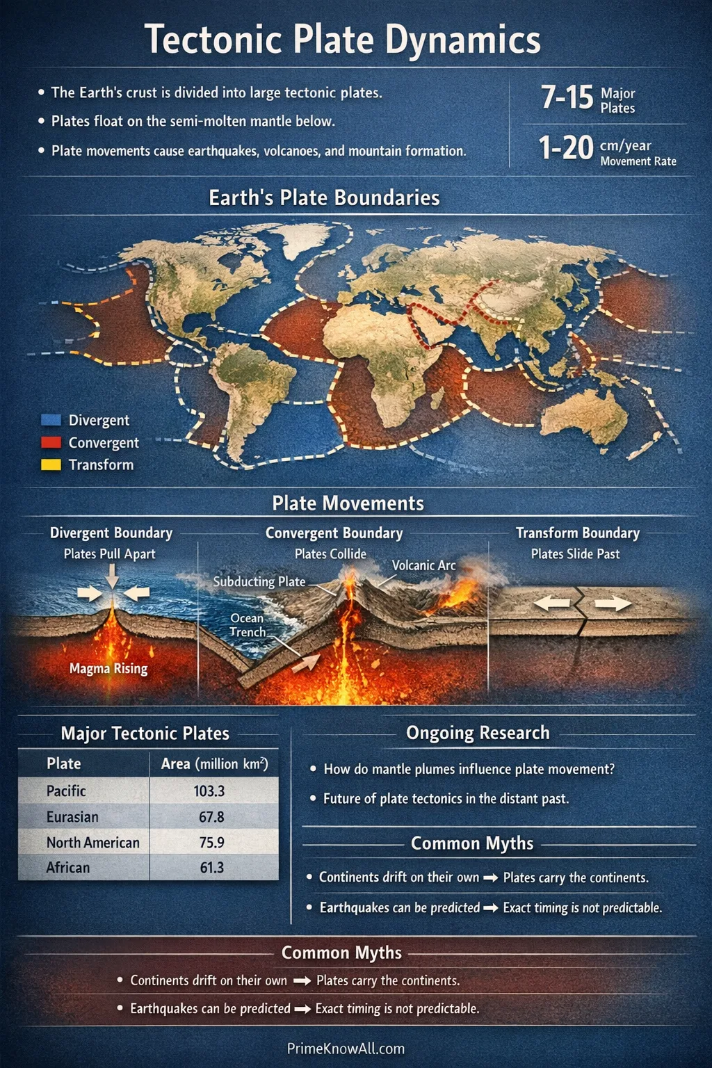 - “Plates always move smoothly.” Average motion can be steady, but faults can lock and then slip suddenly, creating earthquakes that release strain in seconds.