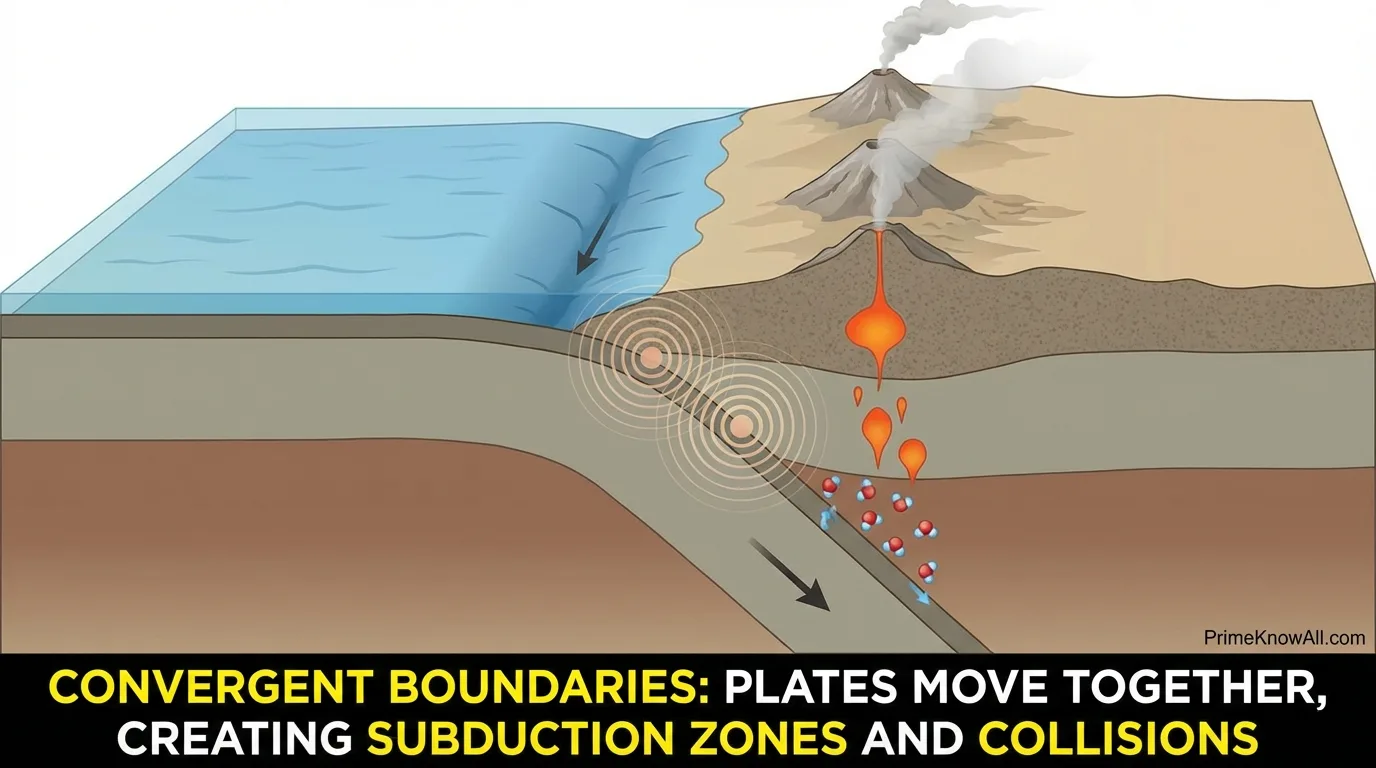 | Convergent (Subduction) | Plates move together; one sinks | Ocean trenches, volcanic arcs, accretionary wedges | Large earthquakes, tsunamis, explosive volcanism | Andes, Japan Trench, Aleutian Arc |