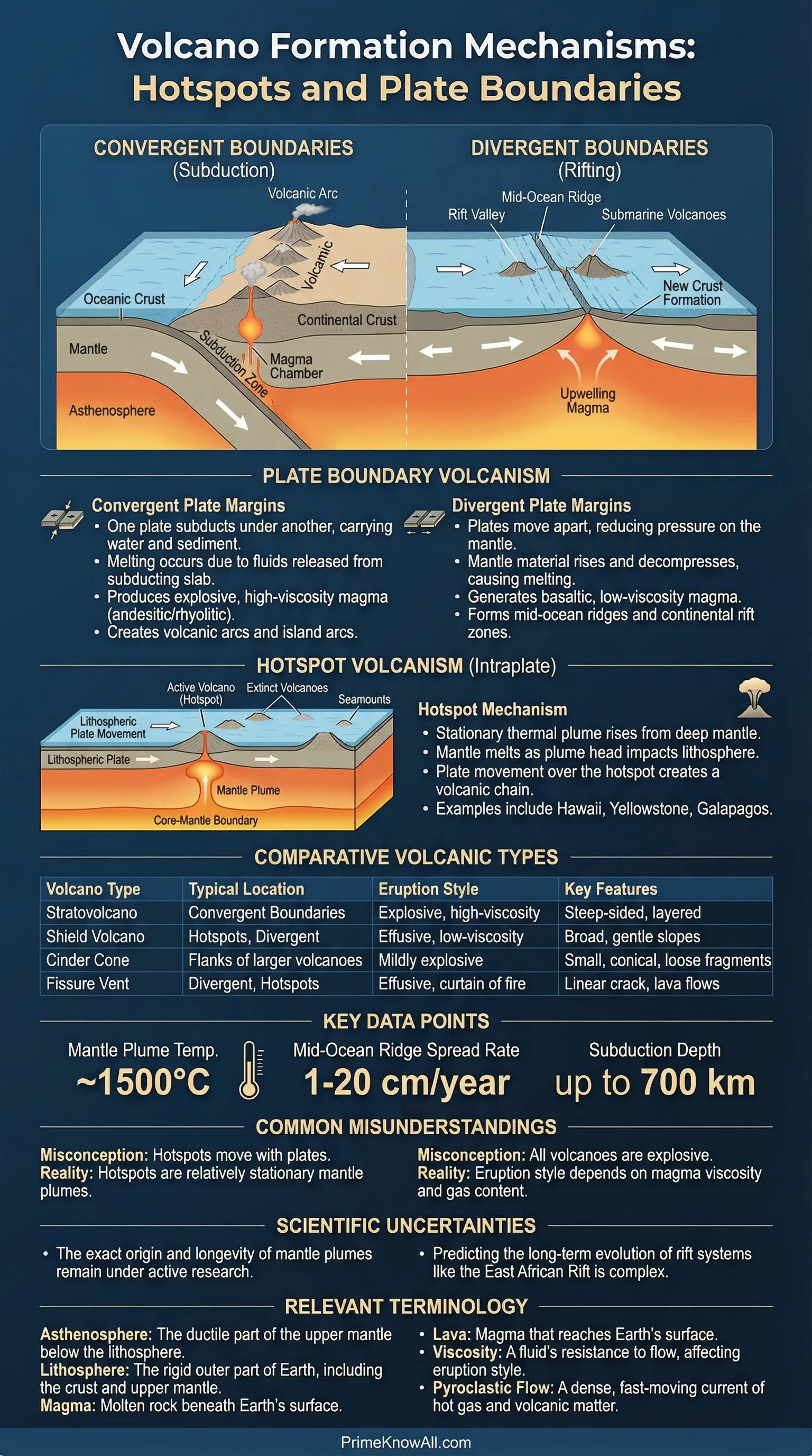 Summary: Plate boundaries generate volcanism mainly through decompression (divergence) or volatile-aided melting (subduction). Hotspots generate volcanism through persistent magma supply inside a plate, often leaving age-progressive trails.