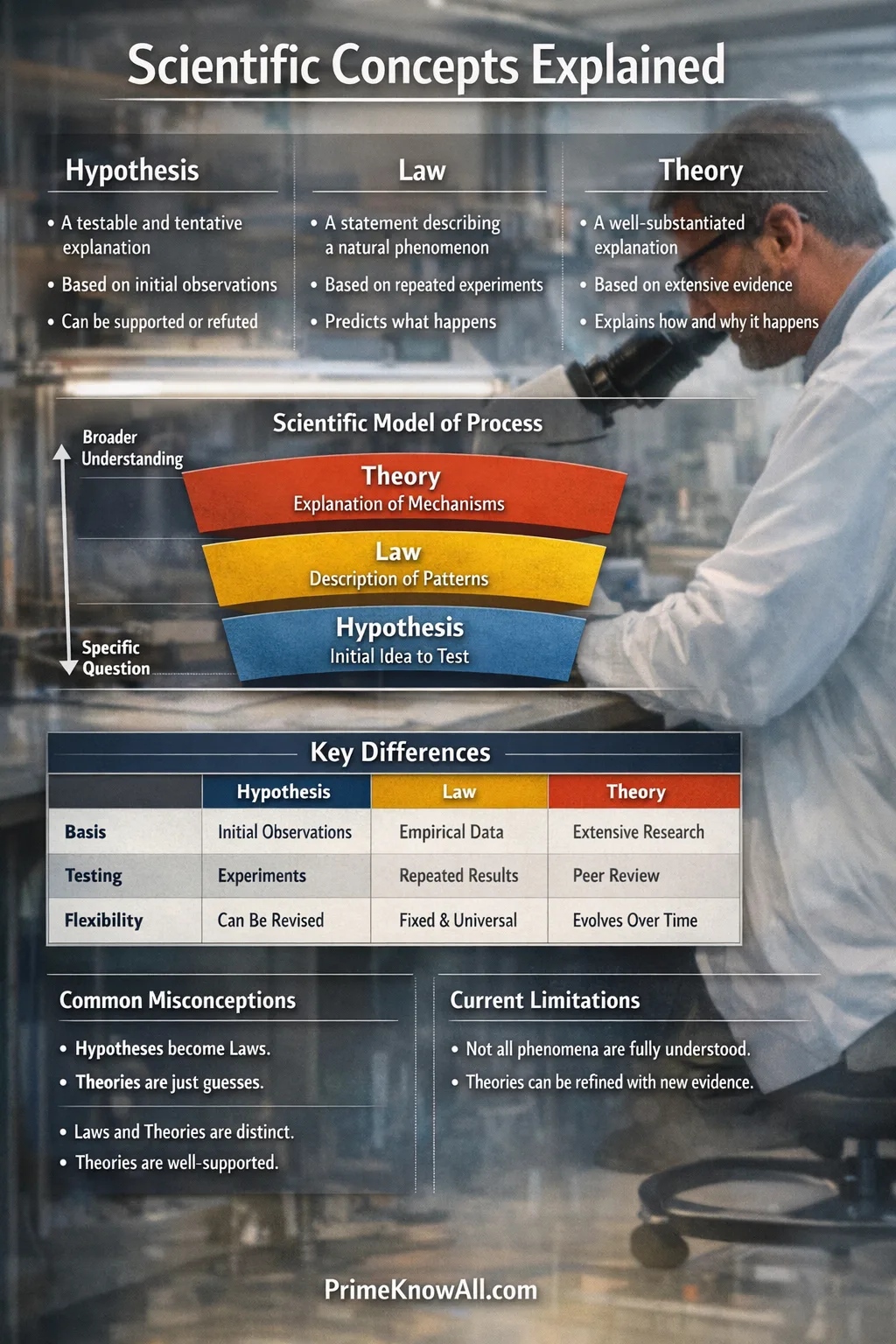 Summary: A hypothesis is a testable proposal, a theory is a well-supported explanation that connects many findings, and a law is a reliable description of a relationship under stated conditions. Science uses all three because describing patterns and explaining them are different tasks.